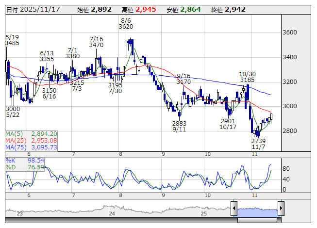 11月7日につけた2739円を安値にリバウンド基調を継続しており、抵抗線として意識されている25日線を捉えてきた。25日線を明確に上抜けてくるようだと、3100円辺りに位置する75日線のほか、10月末の戻り高値3185円が射程に入ろう。一目均衡表では雲を下回って推移しているが、2960円辺りに位置する基準線をクリアすると、雲下限の3050円辺りがターゲットになりそうだ。