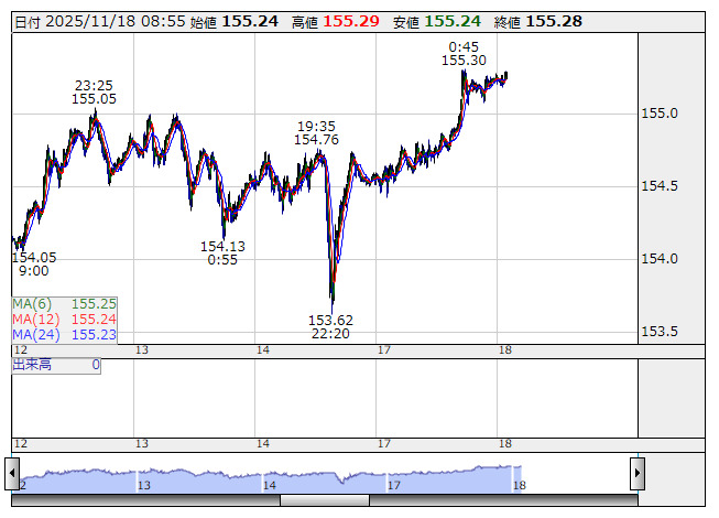 2025年11月18日09時01分 【通貨】外為:1ドル155円28銭前後と大幅なドル高・円安で推移 米ドル/円 <5分足> 「株探」多機能チャートより 18日の外国為替市場のドル円相場は午前9時時点で1ドル=155円28銭前後と、前日午後5時時点に比べ59銭の大幅なドル高・円安。ユーロ円は1ユーロ=179円97銭前後と33銭のユーロ高・円安で推移している。 株探ニュース