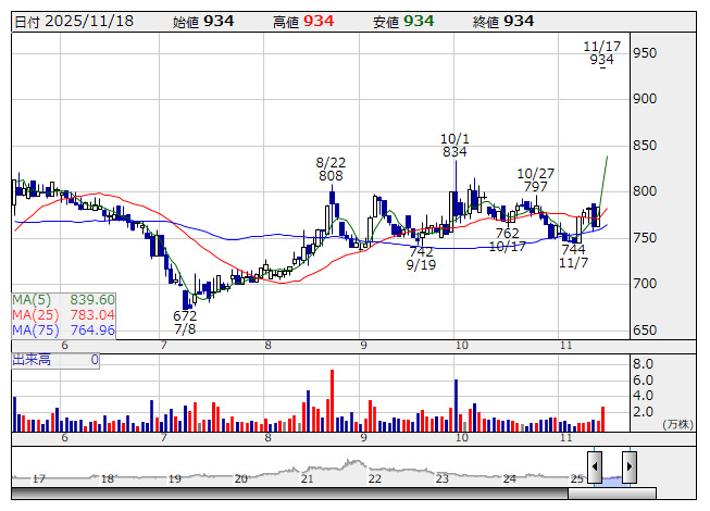 オーケストラ <日足> 「株探」多機能チャートより11月18日9時03分38秒現在、特別買い気配は16銘柄、特別売り気配は21銘柄となっている。
