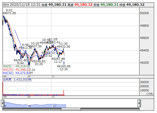 日経平均 <1分足> 「株探」多機能チャートより日経平均 : 49432.56 (-891.35)