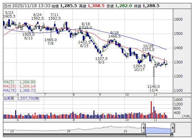 2025年11月18日13時33分 【テク】ZOZO---抵抗線突破からの一段のリバウンドを想定 ZOZO <日足> 「株探」多機能チャートより <3092> ZOZO 1288.5 +6.5 しっかり。下向きで推移する25日線に上値を抑えられる形での調整トレンドを形成している。ただし、11月4日につけた1140円までの下げで、長い下ヒゲの残す形での大陽線をつけており、目先底が確認された格好であろう。足もとでの緩やかなリバウンドで25日線を捉えてきたことで、抵抗線突破からの一段のリバウンドを想定した押し目狙いの買いが入りやすくなりそうだ。 《FA》 提供:フィスコ