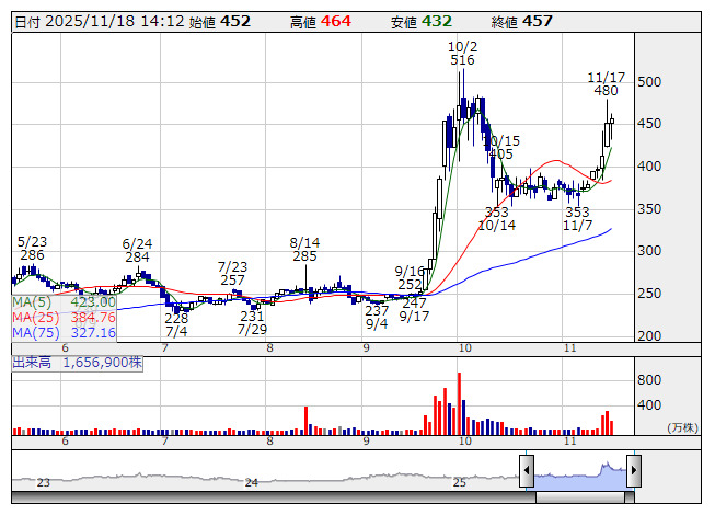 3719>が7日続伸。同社は14日の取引時間中に25年12月期の業績予想の上方修正を発表した。AI&モルタル事業(旧デジタルサイネージ事業)では、実物資産活用型のトラックファンドの組成が想定以上となり、ファンドの販売も好調だったという。決算発表を受けた買いが続くなかで、18日にはサーバー・ネットワークなどのIT機器販売において、売り上げが6億円以上へ到達したと公表。国内大手オンライン配信プラットフォームを含む複数の事業者に対しライブ配信基盤の高度化を支援しており、今後も事業成長の加速を図る構えを示している。この日の同社株は朝方に下げに沈む場面があったが持ち直し、発表を受けて強含んだ。