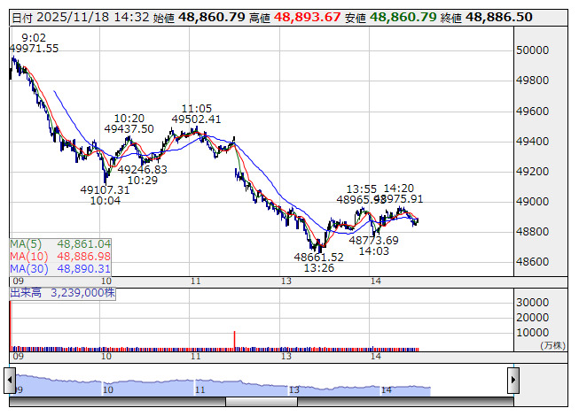 昨日の米株式市場で主要指数が下落した流れを受け、今日の東京市場は売りが先行し、日経225先物は下落して始まった。市場では、今日予定されている高市首相と植田日銀総裁との会談や、19日予定の米エヌビディアの8-10月期決算発表などのイベントが警戒材料として意識されている。こうした中、今日は取引開始後に日経225先物が大幅安となっていることもあり、ボラティリティーの高まりを警戒するムードが強まり、日経VIは昨日の水準を大幅に上回って推移している。