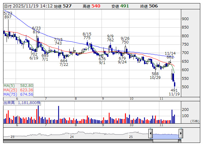 海帆 <日足> 「株探」多機能チャートより前週末14日の取引終了後、26年3月期の連結業績予想を未定に修正したことが、引き続き売り予想数の上昇につながっているようだ。ネパール水力発電事業に関して、完全撤退も視野に入れた事業の停止(再検討)をすることを決定。今後の進捗が不透明なことから、現段階では業績予想の合理的な算定が困難であるためとしている。