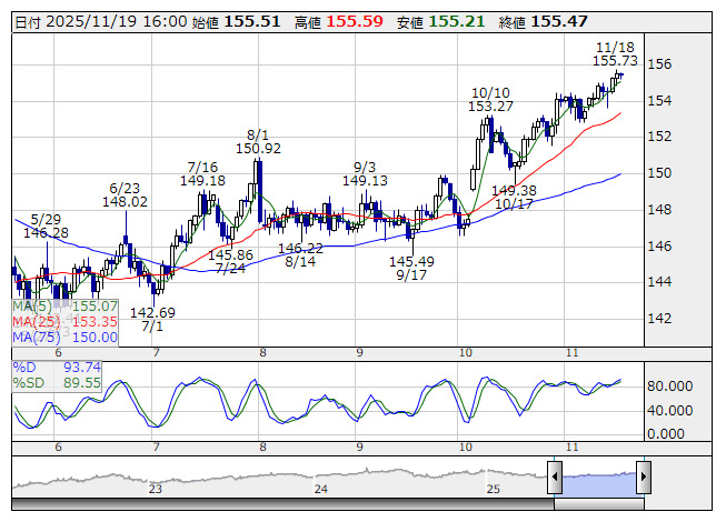 2025年11月19日16時01分 【通貨】外為:1ドル155円46銭前後とドル高・円安で推移 米ドル/円 <日足> Slowストキャス 「株探」多機能チャートより 19日の外国為替市場のドル円相場は午後4時時点で1ドル=155円46銭前後と、前日午後5時時点に比べ46銭のドル高・円安。ユーロ円は1ユーロ=180円13銭前後と48銭のユーロ高・円安で推移している。 株探ニュース