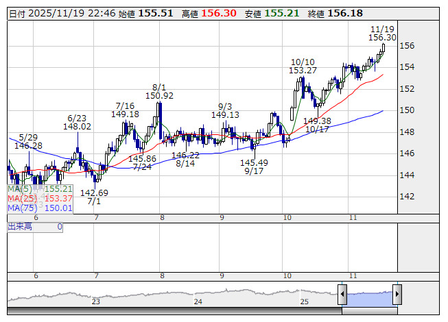 貿易赤字縮小で成長に寄与した可能性が示唆された。ドルは堅調。ドル・円は156円17銭で高止まりとなった。ユーロ・ドルは1.1591ドルの高値から1.1577ドルまで反落した。ポンド・ドルも1.3128ドルから1.3120ドルへじり安となった。