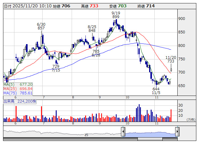 大幅続伸。19日の取引終了後に、取得し得る株式の総数30万株(自己株式を除く発行済株式総数の3.1%)、取得価額の総額2.46億円を上限として、自社株買いを実施すると発表し、好材料視されている。取得期間は25年11月20日~26年2月28日。自社株買いを実施する理由は、経営環境の変化に対応した機動的な資本政策の遂行と株主還元の充実を図るためとしている。また、将来的に見込まれる譲渡制限付株式報酬の自己株式処分やストック・オプションの行使に備えて実施する。