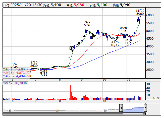 6039>は20日の取引終了後、12月16日を基準日として1株を5株に株式分割すると発表した。投資単位当たりの金額を引き下げることで株式を保有しやすい環境を整えるとともに、新NISA制度でも活用しやすい水準にすることを通じて投資家層の拡大と流動性の向上を図る。期末一括配当予想は実質据え置きの8円とする。今期は既に上方修正を2回実施していることを踏まえ、現在慎重に配当方針に基づく利益還元について検討しているという。