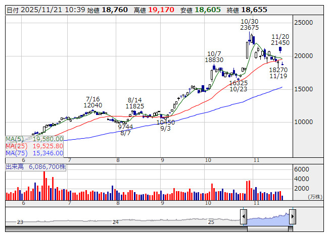 6857>は大幅反落。前日は、米エヌビディアが決算発表後に時間外取引で上昇したことから安心感が強まり、大幅上昇する展開になっていたが、本日は一転して前日の上昇幅を消す動きとなっている。エヌビディアは前日の米国市場で買い先行となったが、その後は伸び悩んで3%超の下落となっている。AI関連株に対する過熱警戒感があらためて意識される状況となっているもよう。なお、米利下げ期待の後退などもハイテク株には逆風となっている。