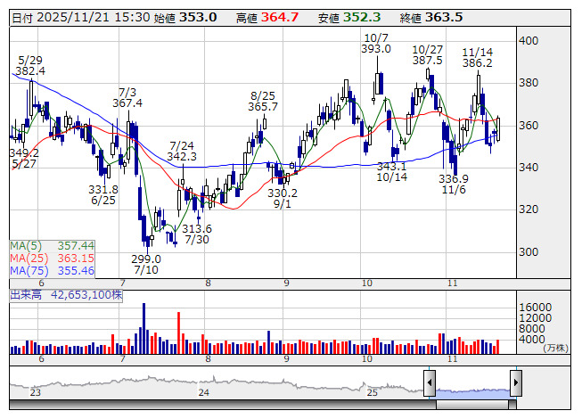 日産自 <日足> 「株探」多機能チャートより●信用売り残増加ランキング【ベスト50】