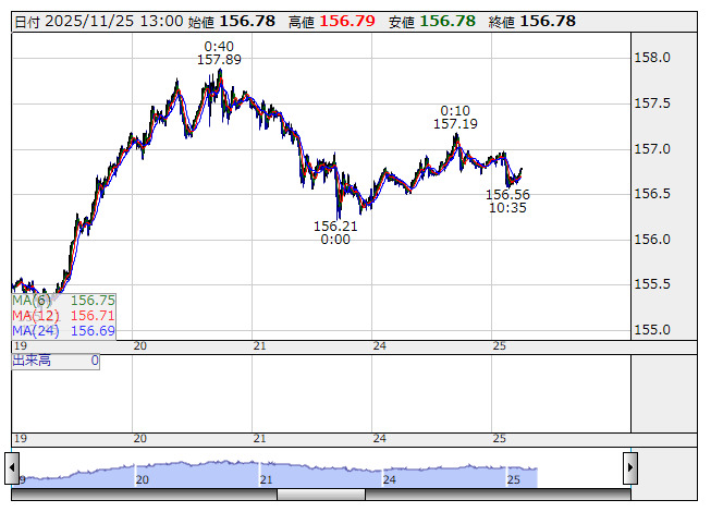 2025年11月25日13時01分 【通貨】外為:1ドル156円79銭前後と横ばい圏で推移 米ドル/円 <5分足> 「株探」多機能チャートより 25日の外国為替市場のドル円相場は午後1時時点で1ドル=156円79銭前後と、前日午後5時時点に比べ3銭のドル安・円高と横ばい圏。ユーロ円は1ユーロ=180円58銭前後と7銭の小幅なユーロ高・円安で推移している。 株探ニュース