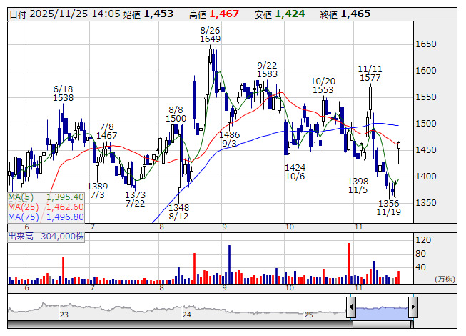 5036>は大幅続伸。発行済み株式数の2.63%に当たる120万株、24億円を上限とする自己株式の取得実施を発表している。取得期間は11月25日から26年2月28日までとしている。取得理由としては、株式報酬制度に関連して交付される株式につき、取得する自己株式を充当することで、希薄化を回避するとともに、経営環境の変化に対応した機動的な資本政策を遂行するためとしている。目先の需給改善につながるとの期待感が先行へ。