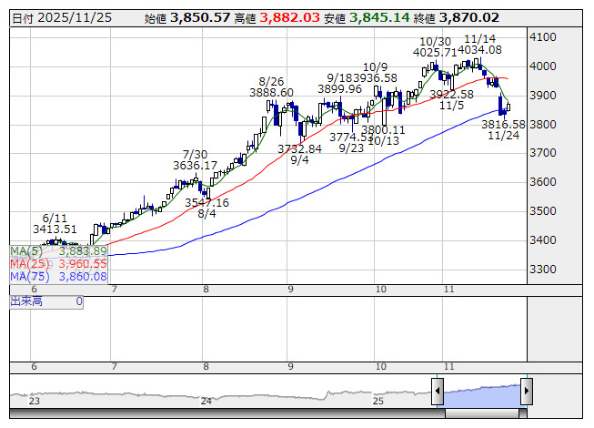 2025年11月26日16時46分 【市況】26日中国・上海総合指数=終値3864.1844(-5.8384) 上海総合 <日足> 「株探」多機能チャートより 26日の中国・上海総合指数の終値は前営業日比5.8384ポイント安の3864.1844と3日ぶり反落。 出所:MINKABU PRESS