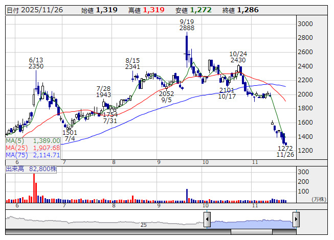 カウリス <日足> 「株探」多機能チャートより1)本日(11月26日)引け後に発表された決算・業績修正