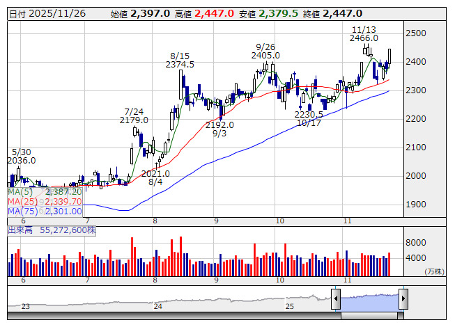<6762> TDK 11282 ( 45) 2,457.5 -11 ( -0.4%)