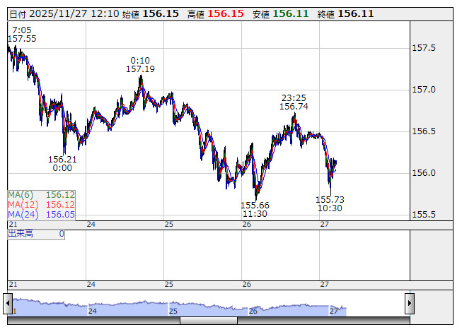 米ドル/円 <5分足> 「株探」多機能チャートより27日午前の東京市場でドル・円は下げ渋り、156円49銭から155円73銭まで売られた後、156円18銭まで反発。155円台後半で顧客筋などのドル買い興味が引き続き残されており、ドル・円は155円台後半が底値となる可能性が高まっている。ユーロ・円は181円43銭から180円76銭まで下げた後、一時181円34銭まで反発。ユーロ・ドルは1.1590ドルから1.1613ドルの範囲内で上下。