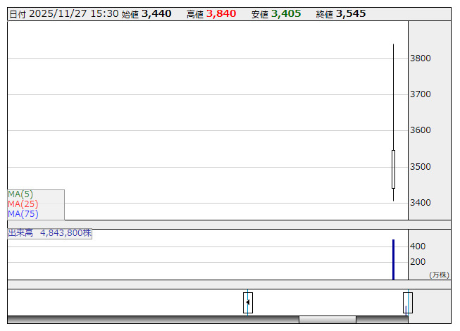 2025年11月27日15時48分 【材料】きょうのIPOの終値、ヒュマメイドは初値上回る3545円で取引終える ヒュマメイド <日足> 「株探」多機能チャートより きょう東証グロース市場に新規上場したHUMAN MADE<456A>は、午前9時19分に公開価格3130円を310円(9.9%)上回る3440円で初値をつけた。初値形成後も強含みで推移し、11時15分には3840円の高値をつけたが、午後は一転して軟化。午後中盤からは3500円を挟んだもみ合いとなり、3545円で初日の取引を終えた。 出所:MINKABU PRESS