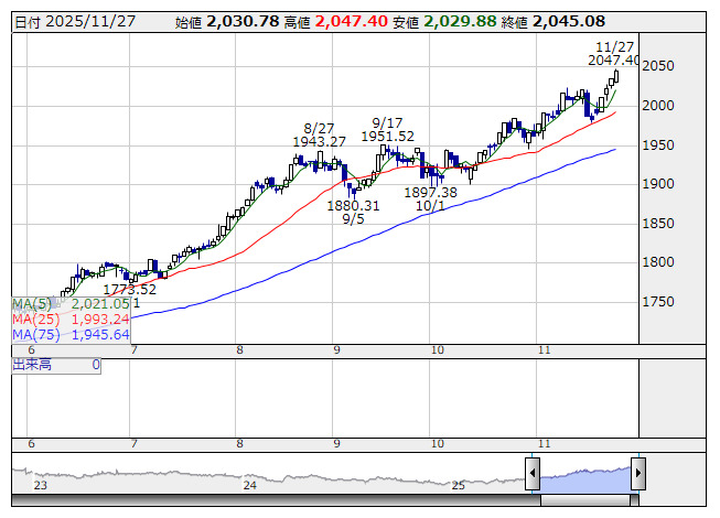2025年11月28日08時46分 【市況】東証REIT指数先物:28日寄り付き=0.5ポイント高、2045.5ポイント REIT指数 <日足> 「株探」多機能チャートより 28日8時45分、東証REIT指数先物期近2025年12月限は前日清算値比0.5ポイント高の2045.5ポイントで寄り付いた。前日の東証REIT指数の現物終値2045.08ポイントに対しては0.42ポイント高。 株探ニュース