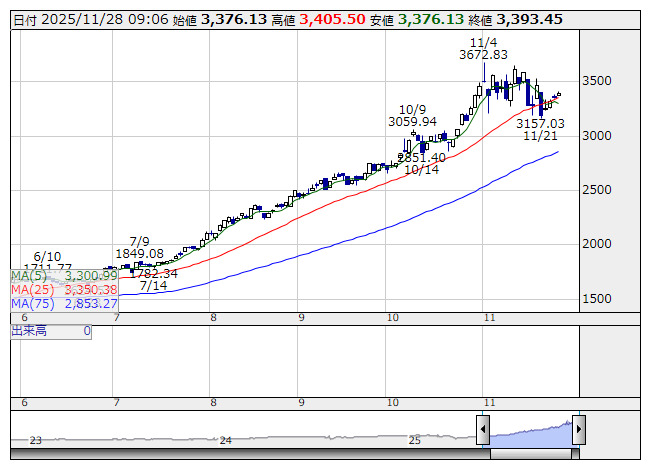 非鉄金属 <日足> 「株探」多機能チャートより●東証33業種 値上がり: 22 業種 値下がり: 11 業種