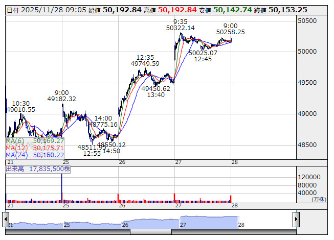 2025年11月28日09時05分 【市況】東京株式(寄り付き)=小幅高、米休場で小幅高のスタート 日経平均 <5分足> 「株探」多機能チャートより 28日の東京株式市場は、日経平均株価が前日比51円高の5万0218円と小幅高で始まった。 前日の米株式市場は、感謝祭の祝日で休場だった。やや手掛かり材料難となるなか、日経平均株価は小幅に上昇してスタートした。また、為替は1ドル=156円30銭前後で推移している。 出所:MINKABU PRESS