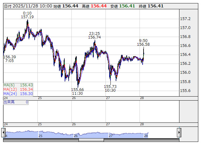 2025年11月28日10時01分 【通貨】外為:1ドル156円43銭前後とドル高・円安で推移 米ドル/円 <5分足> 「株探」多機能チャートより 28日の外国為替市場のドル円相場は午前10時時点で1ドル=156円43銭前後と、前日午後5時時点に比べ32銭のドル高・円安。ユーロ円は1ユーロ=181円37銭前後と41銭のユーロ高・円安で推移している。 株探ニュース