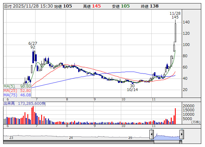 大黒屋 <日足> 「株探」多機能チャートより●寄付からの株価上昇率ランキング【ベスト50】