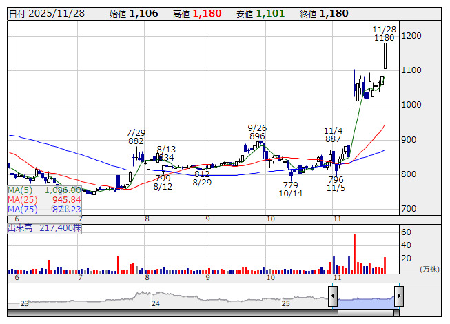 ミナトHD <日足> 「株探」多機能チャートより11月28日の引け後に決算を発表した銘柄のなかから、業績好調や配当増額など市場で評価される可能性の高い銘柄を取り上げた。