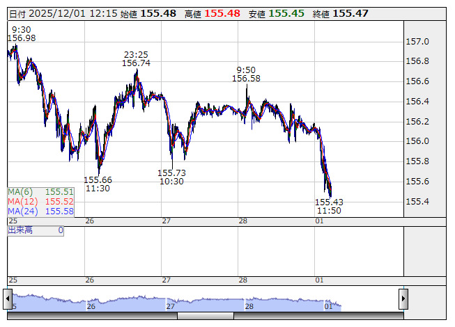 米ドル/円 <5分足> 「株探」多機能チャートより1日午前の東京市場でドル・円は軟調地合いとなり、156円10銭から155円42銭まで値を切り下げた。植田日銀総裁は講演で追加利上げに前向きなスタンスを示し、今月開催の金融政策決定会合で政策金利引き上げを見込んだ円買いが主要通貨を下押し。