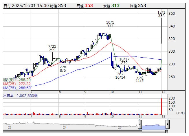 オプトエレ <日足> 「株探」多機能チャートより個別ではオプトエレクトロニクス<6664>、大黒屋ホールディングス<6993>、ウィルソン・ラーニング ワールドワイド<9610>がストップ高。イーソル<4420>、ヒーハイスト<6433>は一時ストップ高と値を飛ばした。ホクリヨウ<1384>、インターライフホールディングス<1418>、美樹工業<1718>、イチケン<1847>、日本ドライケミカル<1909>など68銘柄は年初来高値を更新。ミナトホールディングス<6862>、大東港運<9367>、ユシロ<5013>、オリジナル設計<4642>、愛眼<9854>は値上がり率上位に買われた。