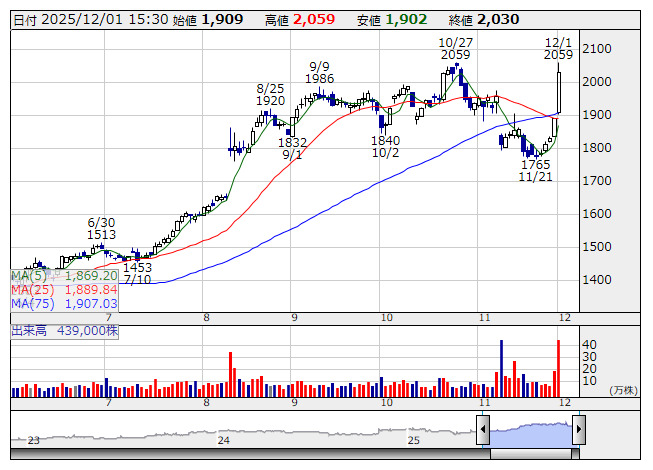 トリケミカル研究所<4369>=急速人気でストップ高。前週末11月28日の取引終了後、26年1月期第3四半期累計(2~10月)の連結決算を発表した。売上高が180億1000万円(前年同期比37.4%増)、営業利益が45億6100万円(同30.2%増)だったとしており、好業績を評価した買いが流入している。同社が手掛ける半導体製造用化学化合物の需要は、生成AIの急速な普及に伴う大規模データセンター投資やPC・スマートフォンへのAI機能搭載の拡大などを背景に増加している。Si半導体向け製品が伸長し、地域別では日本や中国、台湾、韓国などで収益が拡大した。