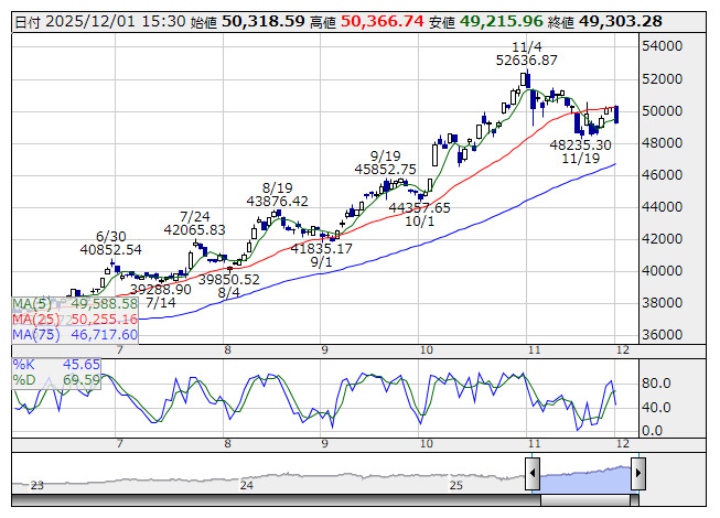 日経平均 <日足> Fastストキャス 「株探」多機能チャートより1日の日経平均は5営業日ぶりに急反落した。ローソク足は大陰線で終了。終値は950.63円安と、先週末にかけての4連騰による上げ幅合計1628.03円の半値押しを超えて下げた。25日移動平均線や節目の5万円を下回ったこともあり、5万円を上回る水準での強い売り圧力を確認する形となった。一目均衡表では基準線下方を走る転換線を下回り、買い圧力の減退を示唆。明日2日以降は応当日株価が上昇していくことで遅行線の弱気シグナル発生の確度が上がるため、チャート形状悪化の可能性に留意したい。