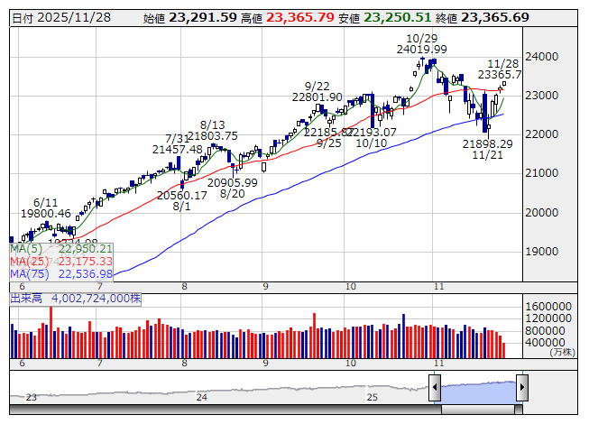 NASDAQ <日足> 「株探」多機能チャートより米国株式市場は大幅反落。ダウ平均は427.09ドル安の47289.33ドル、ナスダックは89.77ポイント安の23275.92で取引を終了した。