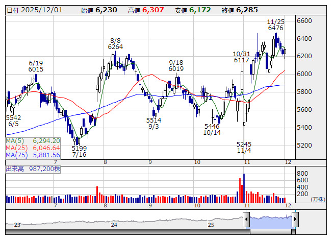 栗田工 <6370> 6,399 +219 ( +3.5%) 7,100 ( 4,544) 6,600 ( 4,223)