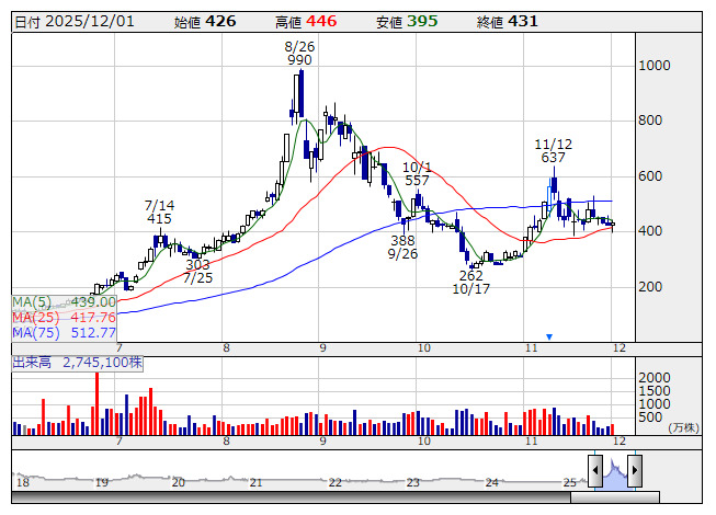 ガーラ <4777> 255 +32 (+14.3%) 77,900 ( 1,994) 77,700 ( 1,981)