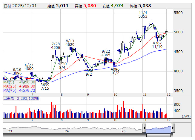 ファナック <6954> 5,299 +261 ( +5.2%) 328,500 (174,105) 306,500 (162,414)