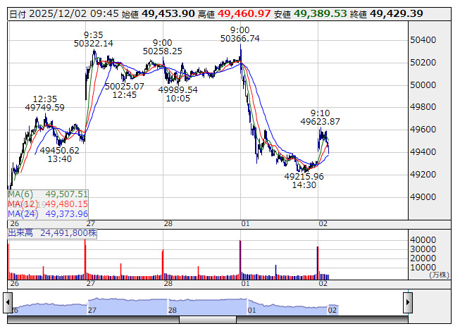 2日の日経平均は191.30円高の49494.58円と反発して取引を開始した。前日1日の米国株式市場は大幅反落。ダウ平均は427.09ドル安の47289.33ドル、ナスダックは89.77ポイント安の23275.92で取引を終了した。暗号資産相場の下落や円キャリートレードの巻き戻しなどのリスクが警戒され、寄り付き後、下落。さらに、ISM製造業景況指数が予想外に悪化し、経済の成長減速懸念も重しとなった。その後も、ベネズエラを巡る地政学的リスクの上昇や、長期金利の上昇も嫌気された。