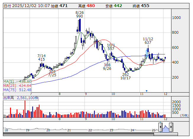 急騰。1日の取引終了後に、データセンター環境向け最新Blackwell世代GPU搭載サーバーの受注開始を発表し、好材料視されている。戦略的パートナーであるデジタルダイナミックと連携し、NVIDIAのAIファクトリーに準じた規格に適合し、新技術(Blackwell アーキテクチャ)を採用したプロフェッショナル向け製品「NVIDIA RTX PRO 6000 Blackwell Server Edition」を搭載した高性能サーバーの取り扱いおよび受注を、12月1日より開始した。