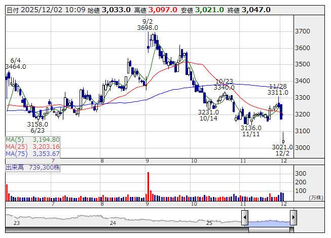2593>が大幅安で3日続落している。同社は1日の取引終了後、26年4月期第2四半期累計(5~10月)の連結決算を発表。売上高は前年同期比4.0%増の2624億7800万円、営業利益は同3.2%減の139億3400万円、最終利益は同3.8%増の95億4200万円となった。中間期の営業利益は減益で着地したほか、8~10月期の営業利益は23%減となった。直近の大幅な営業減益を嫌気した売りがかさんだようだ。原料や資材などの高騰が営業利益を押し下げる要因となったほか、賃上げによる人件費の増加も響いた。