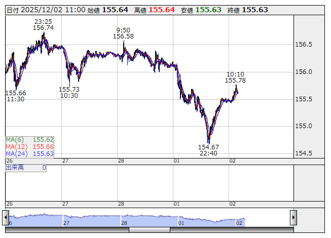 2025年12月02日11時01分 【通貨】外為:1ドル155円63銭前後とドル高・円安で推移 米ドル/円 <5分足> 「株探」多機能チャートより 2日の外国為替市場のドル円相場は午前11時時点で1ドル=155円63銭前後と、前日午後5時時点に比べ27銭のドル高・円安。ユーロ円は1ユーロ=180円67銭前後と34銭のユーロ高・円安で推移している。 株探ニュース