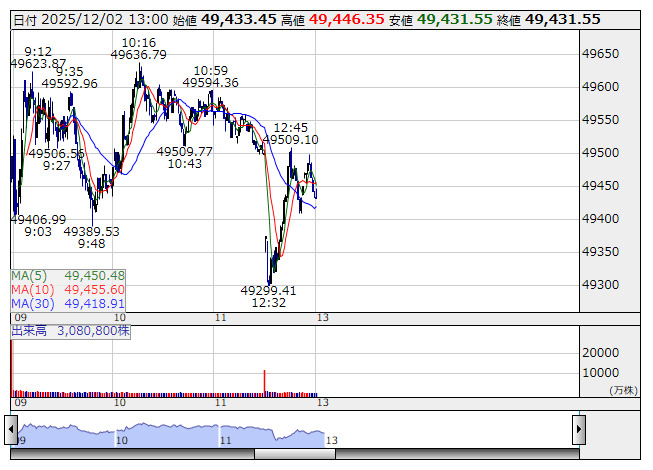 【市況】13時の日経平均は129円高の4万9432円、ファストリが66.58円押し上げ