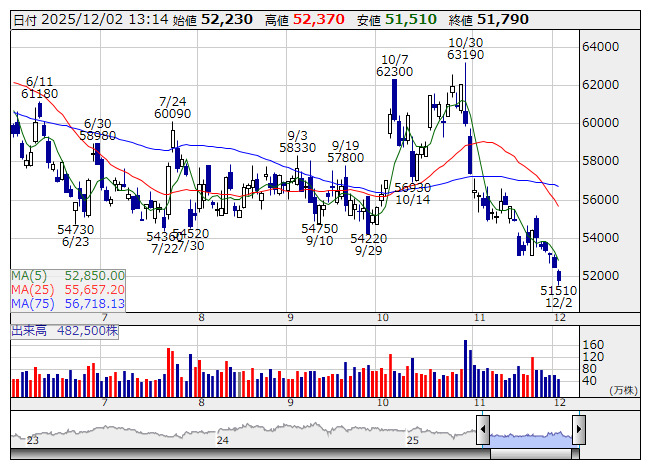 キーエンス <日足> 「株探」多機能チャートより2日の東証プライム市場で、キーエンスが6日続落。同社は10月29日に第2四半期(4~9月)の連結決算を発表し、純利益は前年同期比5.4%増の1999億5900万円となった。北中南米やアジアでファクトリーオートメーション(FA)機器の売り上げが伸びた。26年3月期の配当も従来予想から200円増の550円(前期は350円)とすることも明らかにした。ただ、中間決算の発表後、株価は下落基調となり、この日は5万1000円台と4月安値(4万9780円)に接近している。決算内容は堅調だったが、材料出尽くしからの売りが膨らんだ様子だ。ただ、株価下落で値頃感も台頭しており、市場には反発期待も台頭している。