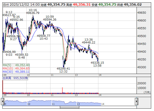 【市況】14時の日経平均は50円高の4万9353円、ファストリが76.21円押し上げ