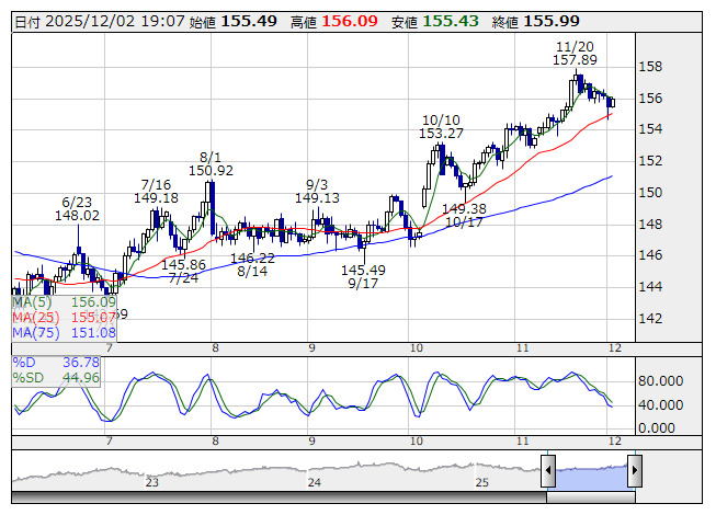 米ドル/円 <日足> Slowストキャス 「株探」多機能チャートより欧州市場でドル・円は買い一服となり、156円08銭まで上昇後は再び155円台に失速した。米10年債利回りの上昇はいったん収束し、ドル買いは後退。一方、ユーロ圏インフレ指標は前月比でマイナス、失業率は悪化したが、ユーロ売りは限定的だった。