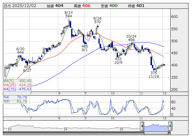 足もとで調整が強まり、200日線割れから11月19日には375円まで売られた。ただ、その後は緩やかなリバウンドをみせるなかで200日線を上回ってきており、目先的には25日線が位置する434円、75日線の476円辺りを意識したリバウンド狙いのスタンスに向かわせそうである。直近の下げでボリンジャーバンドの-3σを割り込む場面をみせるなど、売られ過ぎが意識されやすい。
