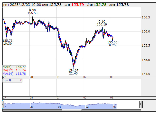2025年12月03日10時01分 【通貨】外為:1ドル155円79銭前後と横ばい圏で推移 米ドル/円 <5分足> 「株探」多機能チャートより 3日の外国為替市場のドル円相場は午前10時時点で1ドル=155円79銭前後と、前日午後5時時点に比べ3銭のドル高・円安と横ばい圏。ユーロ円は1ユーロ=181円19銭前後と31銭のユーロ高・円安で推移している。 株探ニュース