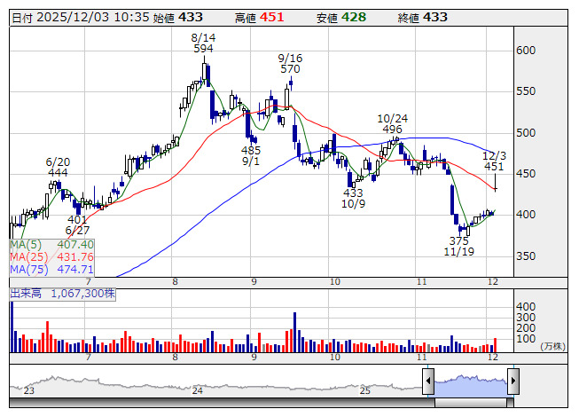 3415>は大幅反発。前日に11月の月次動向を発表している。既存店売上高は前年同月比15.5%増で、13カ月連続でのプラス成長、かつ、2カ月連続での2ケタ成長となっている。実店舗が同12.8%増となったほか、ECも同28.5%増となっている。前年のハードルが高い中での2ケタ成長にポジティブな反応が先行へ。また、中国事業も全店舗が好調に推移し、日中関係悪化による影響が見られていないことも安心感につながっているようだ。