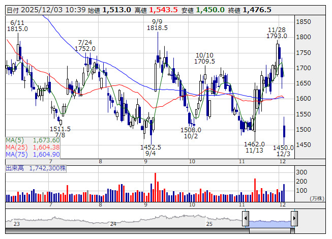 2025年12月03日10時38分 【材料】ペプドリは急落、今期一転営業赤字へ下方修正 ペプドリ <日足> 「株探」多機能チャートより ペプチドリーム<4587>は急落。2日取引終了後、25年12月期連結業績予想について売上高を490億円から180億円(前期比61.4%減)へ、営業損益を216億円の黒字から54億円の赤字(前期211億1300万円の黒字)へ下方修正すると発表した。今期中を見込んでいた特定の開発マイルストンの達成や新規提携が後ずれする見通しとなったため。一転赤字となる見通しを示したことが嫌気されている。 出所:MINKABU PRESS