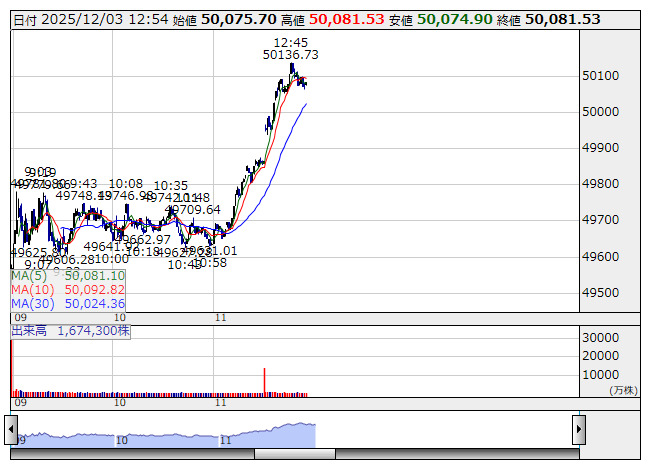米株市場を横目に、12月3日の日経平均は237.19円高の49540.64円と続伸して取引を開始。その後は49700円付近で推移したが、前引けにかけて上げ幅を広げる展開となり、高値圏で前場の取引を終了した。昨日の米株式市場でフィラデルフィア半導体株指数(SOX指数)が1.84%上昇と、ダウやナスダックと比べ上昇率が大きく、東京市場でも半導体関連株の株価支援要因となった。また、米国で来年以降の継続利下げ期待が高まっている点も投資家心理にポジティブに働いている。