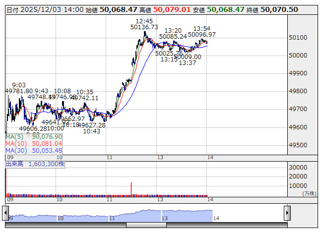 【市況】14時の日経平均は774円高の5万77円、アドテストが348.96円押し上げ