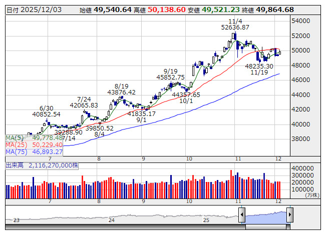 日経平均 <日足> 「株探」多機能チャートより53324.12円 ボリンジャーバンド3σ
